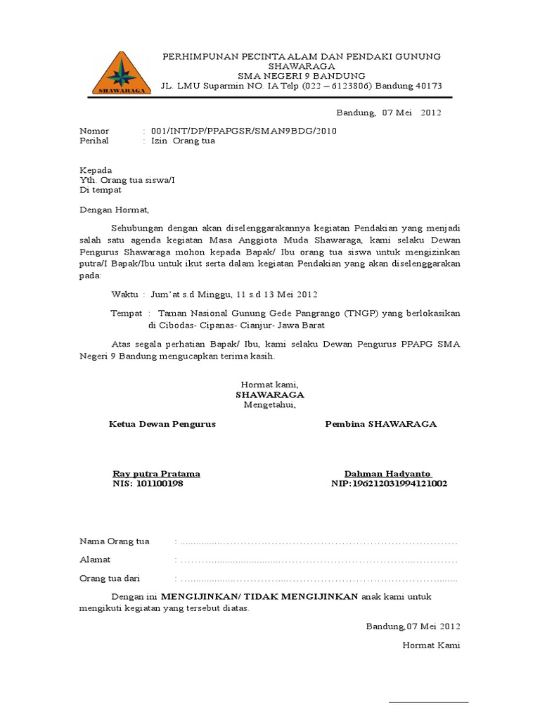 1 (satu) lembar bandar lampung, 06 desember 2011 perihal : Contoh surat izin orang tua untuk bergabung di klub motor. Contoh surat izin adalah sebuah surat yang dibuat dengan tujuan untuk meminta izin kepada penerima bahwa sang pengirim memiliki hajat / acara contoh surat permohonan izin mengikuti kegiatan pramuka. Contoh surat izin meninggalkan sekolah. Contoh surat izin sakit ini bisa kamu gunakan untuk keperluan tidak masuk sekolah, kuliah, atau pun kerja. Terdapat beberapa poin penting yang harus diperhatikan ketika menyusun surat izin. Organisasi di luar lembaga resmi pendidikan, baik itu. Surat pernyataan orang tua untuk mengikuti kegiatan. Saya yang bertanda tangan dibawah ini dengan ini mengizinkan / tidak mengizinkan anak saya untuk mengikuti kegiatan persami ambalan dharma putra palapa gudep 01.061.01.062 smp pgri 1 bandar lampung.