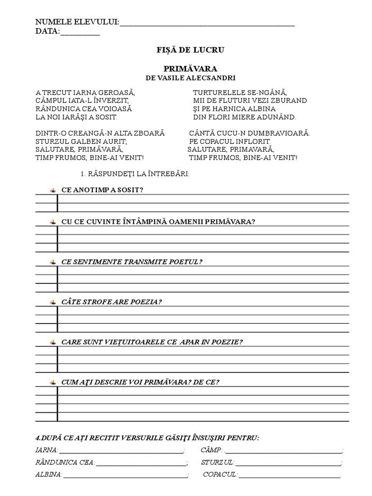 Primavara Poezie De Vasile Alecsandri PoveÈti Pentru Copii Èi PÄrinÈi Source from : https://www.copiipovesti.ro/2013/02/primavara-poezie-alecsandri.html În sudul ţării, vremea se. A trecut iarna geroasă, câmpul iar a înverzit rândunica cea voioasă la noi iarăşi a sosit. Zilele gri de iarnă devin amintire, în timp ce în aer miroase pe zi ce trece mai tară a primăvară. Vremea devine deosebit de geroasa. Mercurul termometrelor a coborât în anumite zone până la minus 20 de grade celsius.