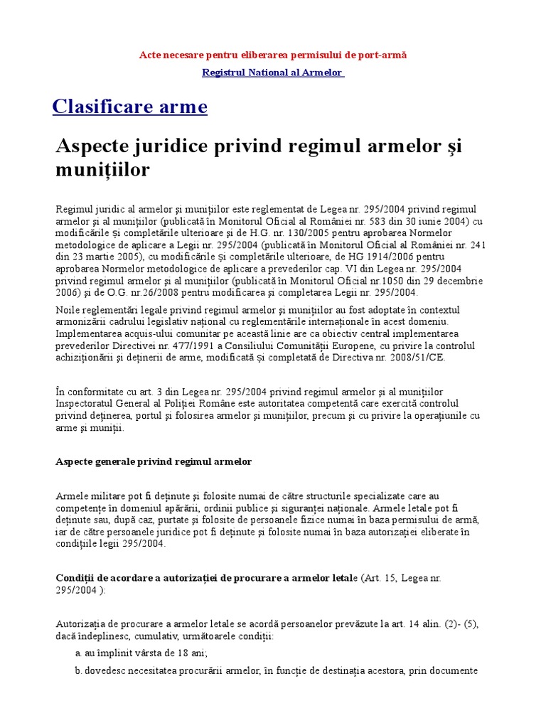 Parlamentul adoptă prezenta lege organică. 295/2004 privind regimul armelor si al (1) al art. Martie 21st, 2017 by redacția prolege.